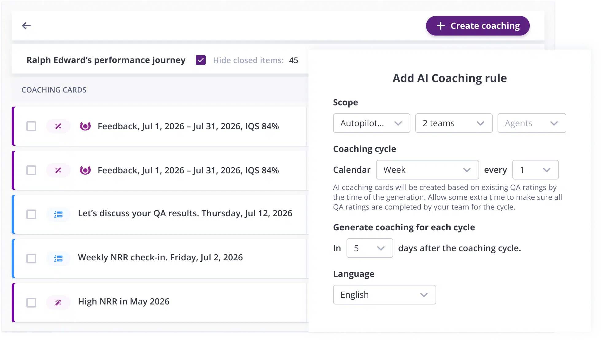 Centralize coaching history, QA scores, one-to-one meeting notes, and tasks in one place. Set goals based on an agent’s actual QA performance curve and trajectory, ensuring everyone has a realistic path to success. Support multilingual teams with coaching cards in all commonly used languages.