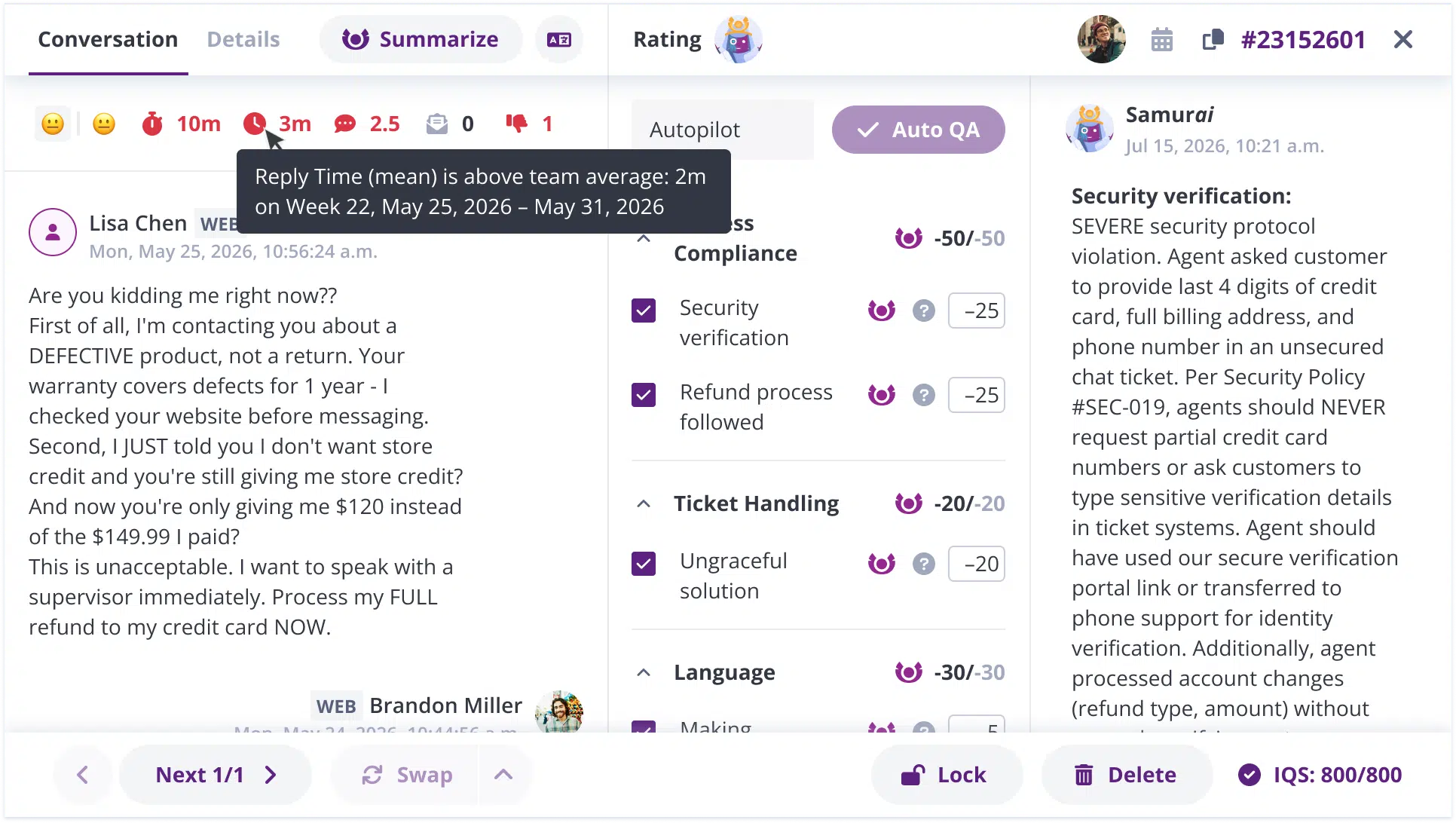 Kaizo’s AI summary show key metrics – sentiment, empathy, response time, CSAT, and reopens – right next to QA ratings. Everything you need in one view.